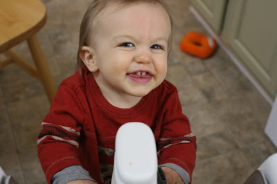 James trying to "push" his Grandpa Mark around the kitchen....this is a game James will absolutely delight in playing, but after the first time we get pretty tired of it. So it's always a treat for James when a new visitor will indulge him in his favorite game.